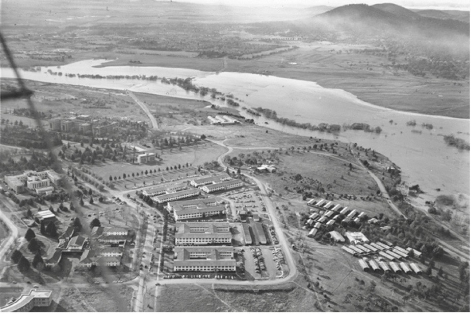 Molonglo river in flood 1956. Landmark Apartments site is lower right, Hotel Kurrajong lower left. (Photo via http://www.randomkaos.com)