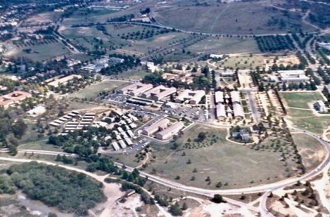 Barton pre-lake. Bowen Drive with the current curved access road to Bowen Drive apartments is in the foreground. Police College centre-left side. (Photo via Terry Walker)