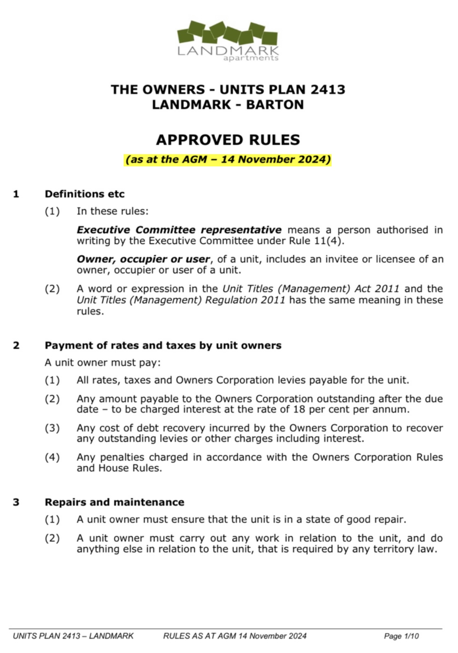 The EC has developed House Rules that amplify and complement Landmark Apartments ‘Approved Rules’ as provided by the Unit Titles (Management) Act 2011. House Rules are intended to enable a harmonious community, based on cooperation and consideration for others; to keep annoyance to a minimum; and to provide appropriate guidelines for residents and their guests. House Rules are to be included as an integral part of any leasing arrangement between a unit proprietor and the tenant.